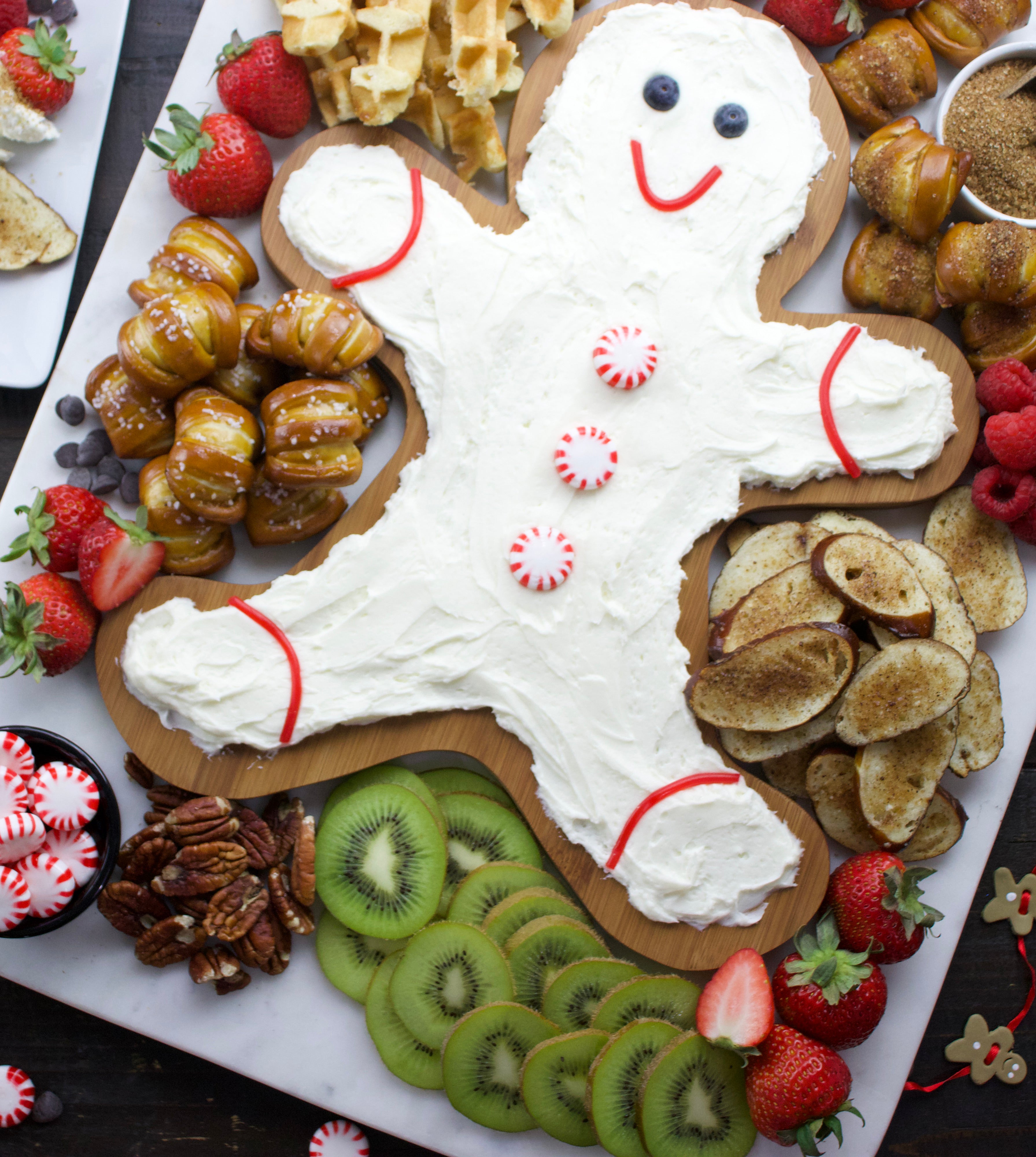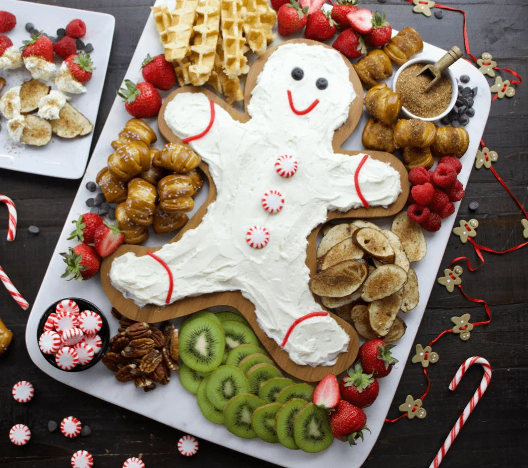 A whimsical Gingerbread Man–shaped cream cheese board made for holiday dipping. Perfect with soft pretzels, fresh fruit, and assorted festive candies.