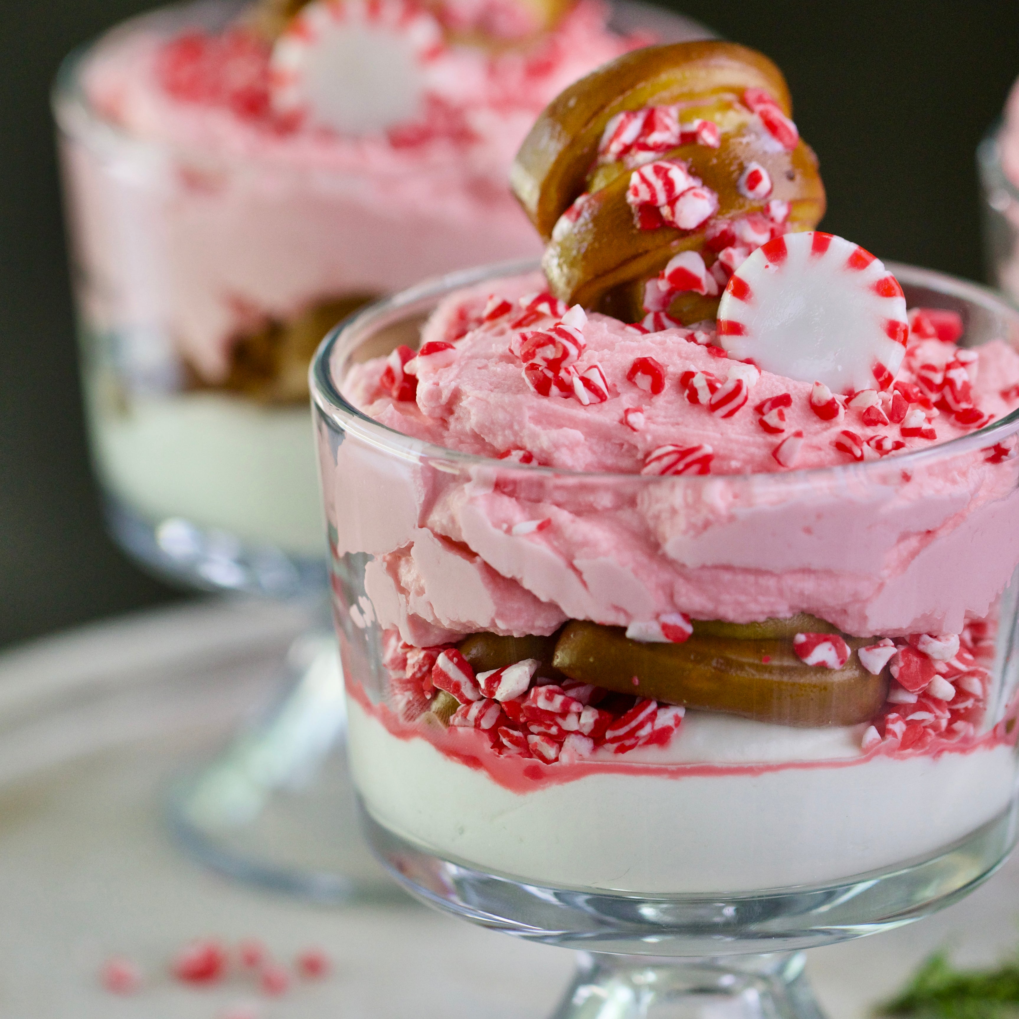 A festive, pink-swirled trifle with fluffy peppermint cream, sweet crunch, and soft pretzel bites layered into pure holiday joy.