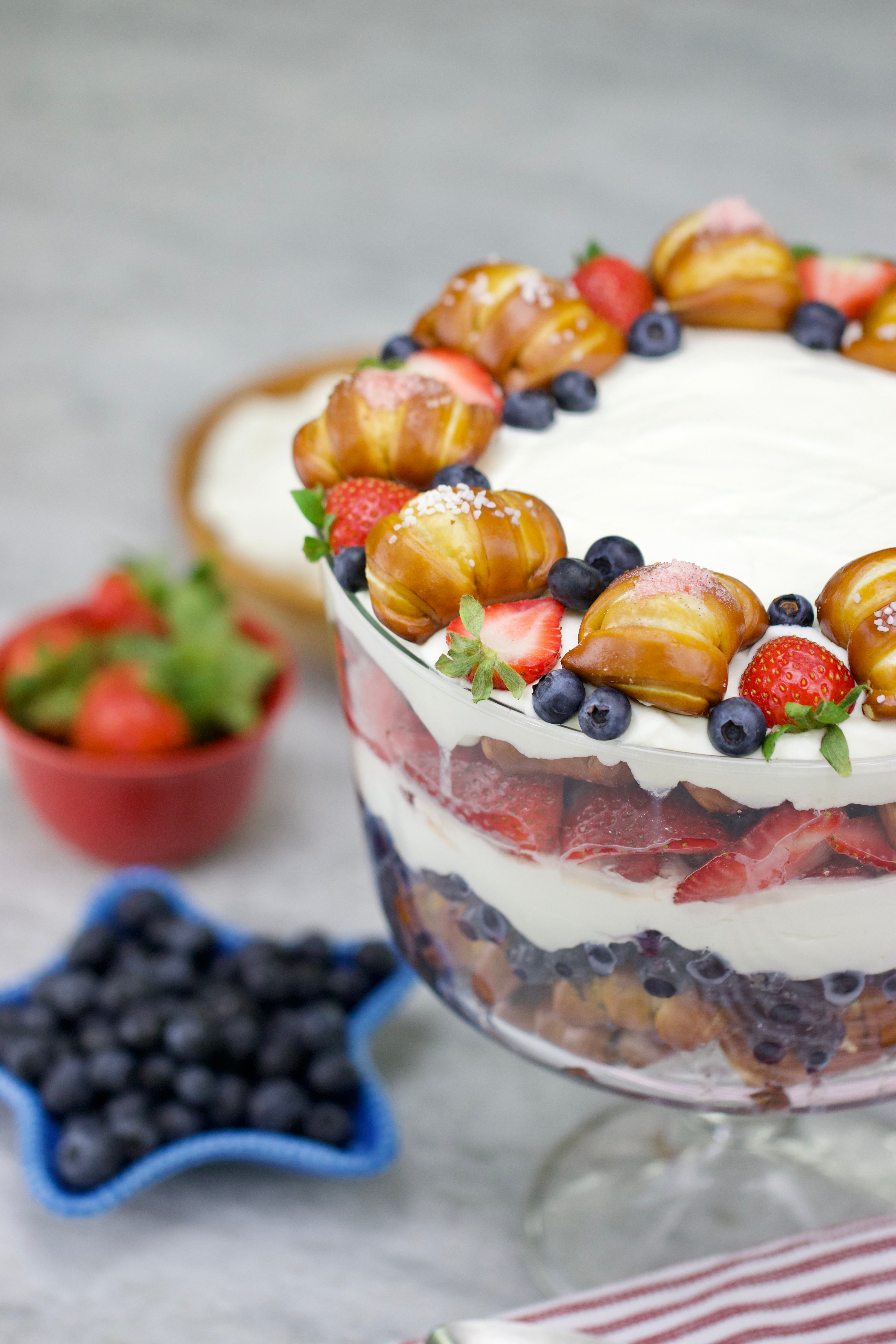 This Red, White & Blue Soft Pretzel Trifle layers soft pretzel bites with vanilla whipped cream, white chocolate pudding, and fresh berries for the ultimate sweet and salty dessert.