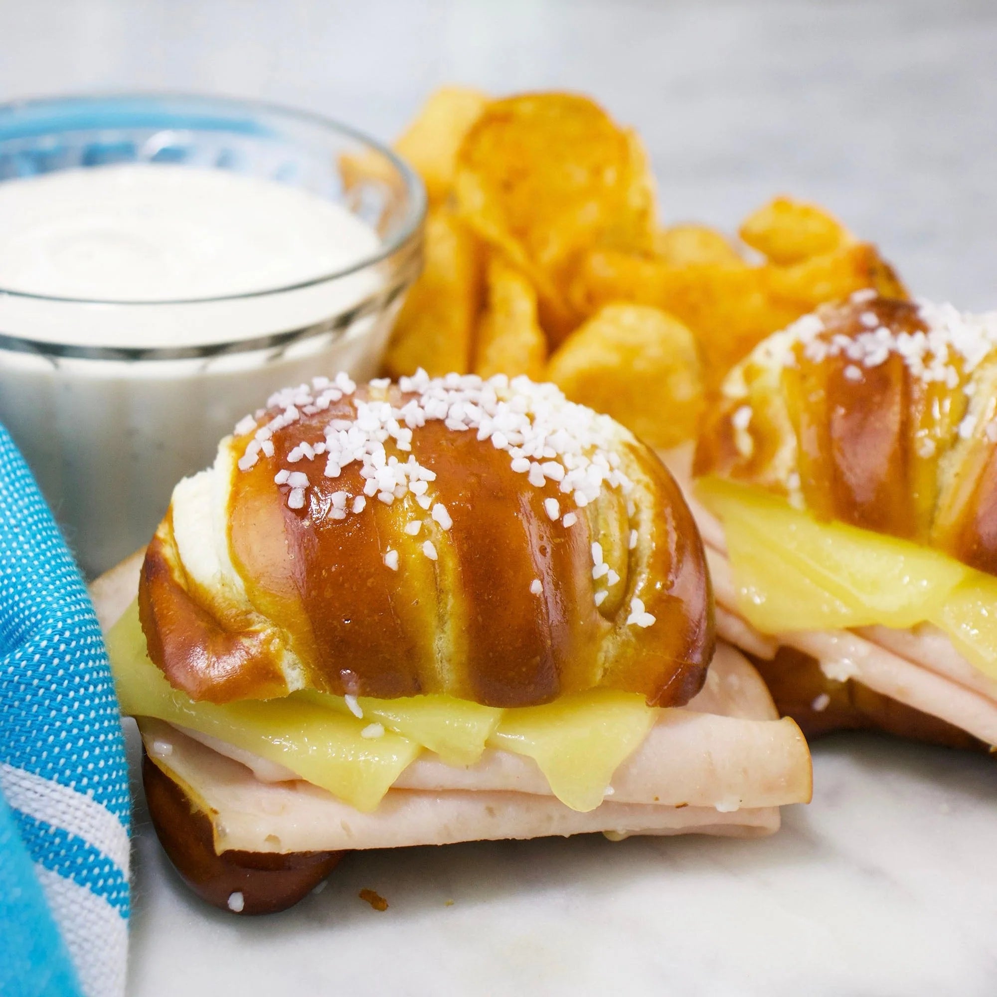 There are few flavor combinations more classically Game Day than buffalo and blue cheese. For that reason, we've cooked up a Buffalo Blue Cheese dip that pairs perfectly with artisanal pretzels, either as a dipping sauce for One-Time Soft Pretzel Bites or as a flavorful spread for chicken sliders made on SlidePiece Soft Pretzel Slider Buns.
